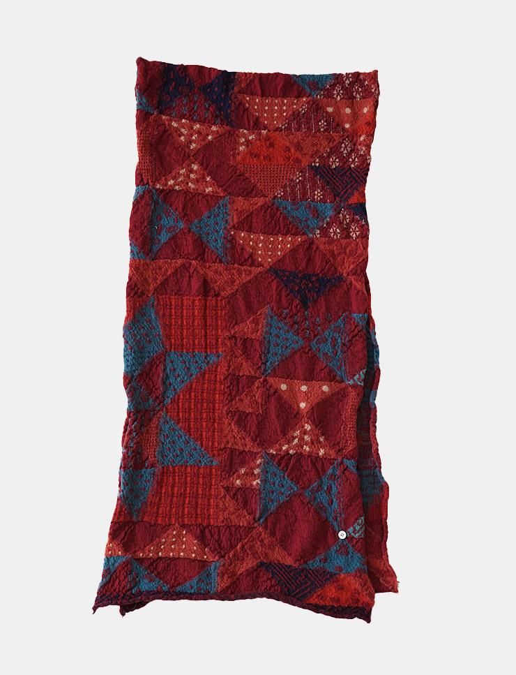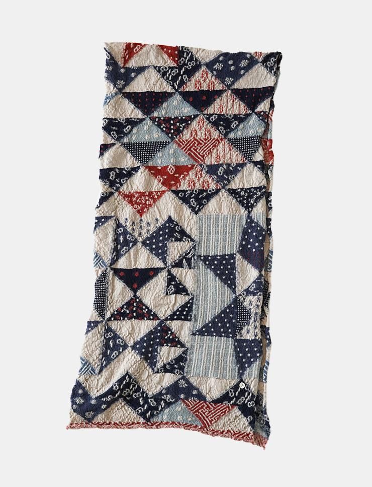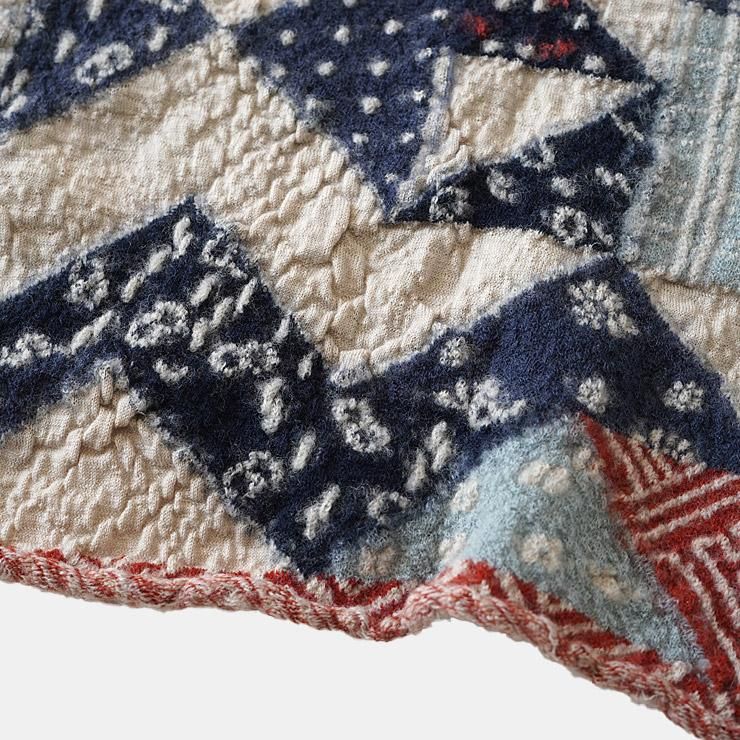 様々な柄を三角形で繋ぎ合わせた、裂織のような豊かな色合いのデザインです。